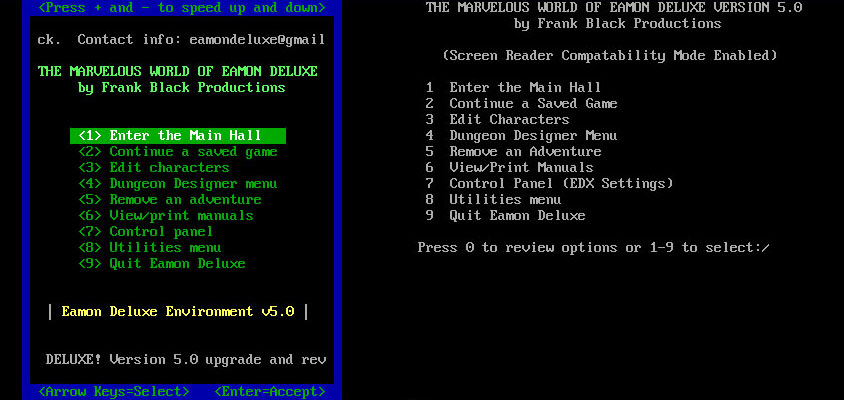 The following are shots showing Eamon Deluxe running on Windows 7 and Win XP and give samples of the revised Main Menu (no more bad color usage and awful 40-column text!), adventure selection menu, Graphic Main Hall, Beginner's Cave, and a couple comparison shots that show the new "VI Mode" setting which allows full compatibility for visually impaired gamers. VI Mode implements dual menus and extra descriptions to things those players previously missed while not sacrificing any convenience or visually-oriented special effects that caused problems in the past. Progress is still moving fairly well and I still hope to have those beta copies sent out very soon.