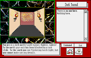 Well, I can't tell you yet. Either as a function of poor emulation or a buggy HyperCard stack, I'm not able to get beyond the doors. But we can venture over to the Beginners Cave to get a sense of how HyperCard Eamon plays.